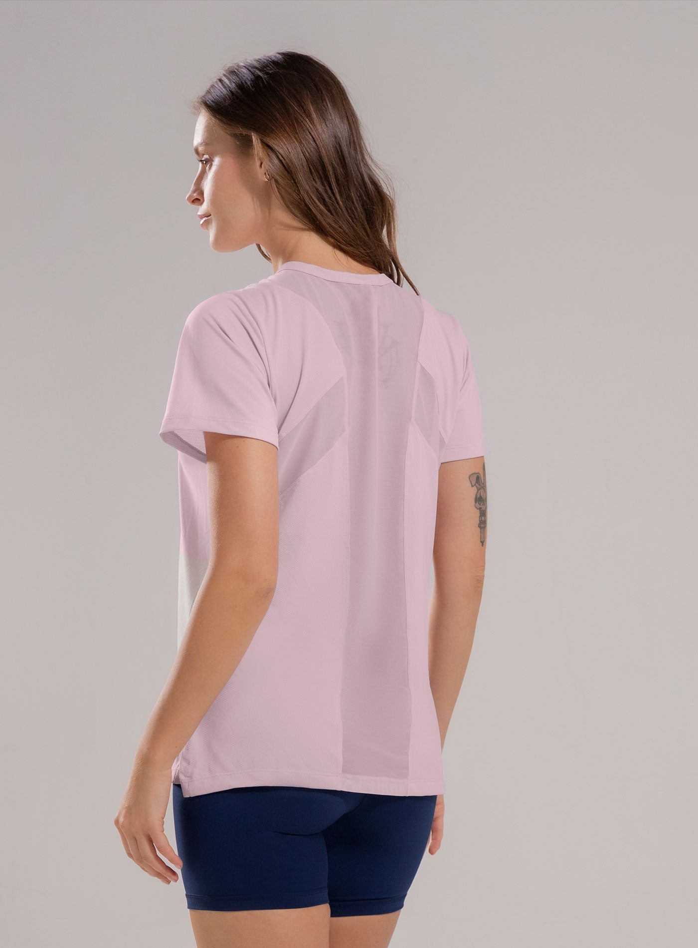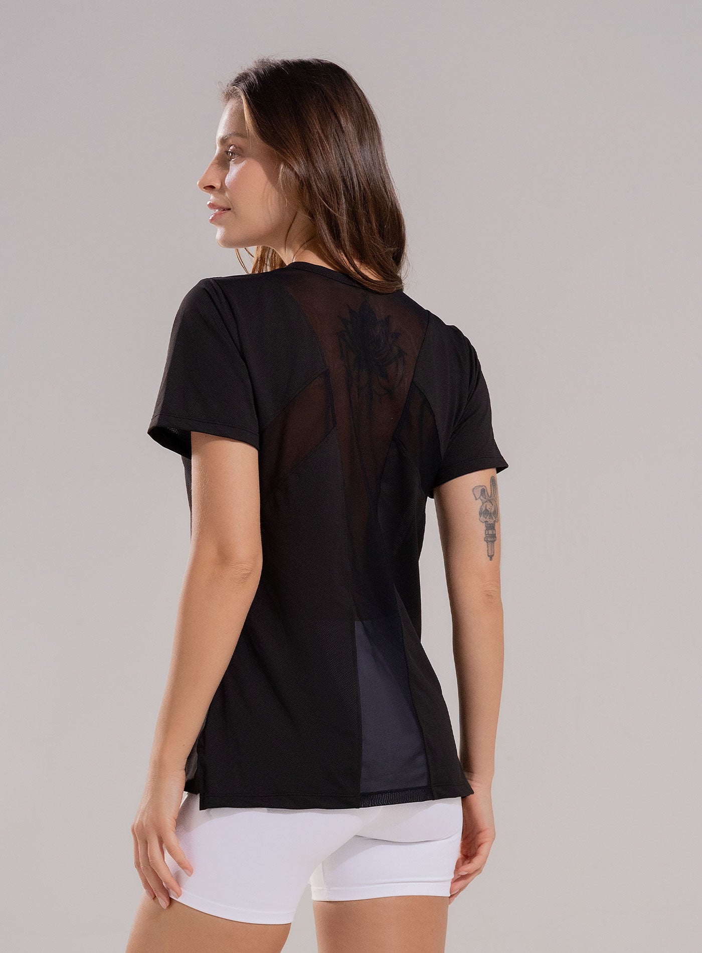 Blusa deportiva de manga corta con cortes en espalda en malla tull y leves aberturas en costados (ruedo).