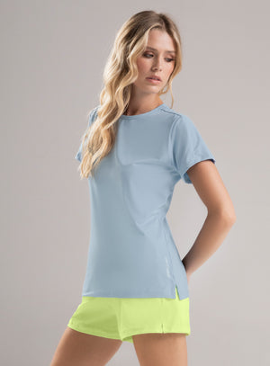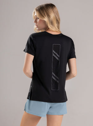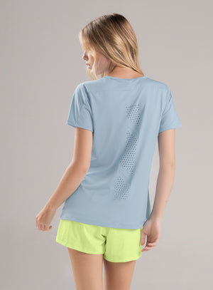 camiseta básica deportiva dama de manga corta y con leves aberturas en los costados. (zona ruedo) diseño estampado y corte laser ubicado en centro espalda