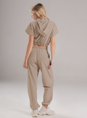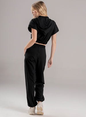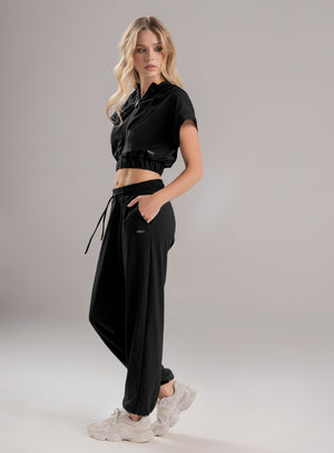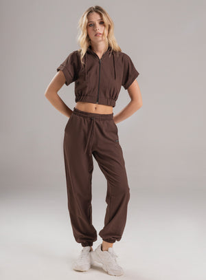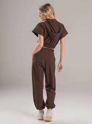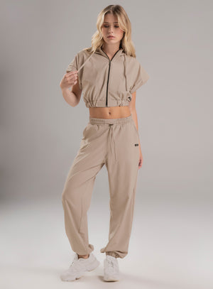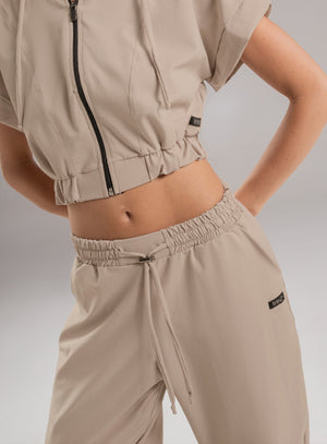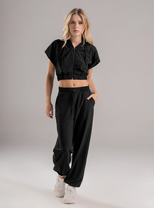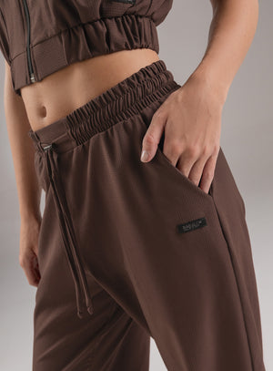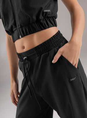 pantalón deportivo dama en tela semi impermeable, pretina y bota con elástico interno para mejor ajuste, bolsillos funcionales en costados y cordón con terminal para ajustar a la medida en cintura