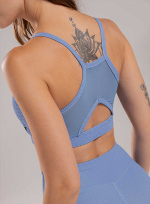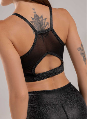 Top deportivo de cargaderas con acabado brillante y espalda en malla tull con corte cut out en el centro, tela de acabado brillante.