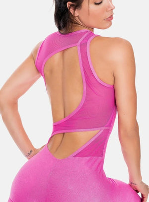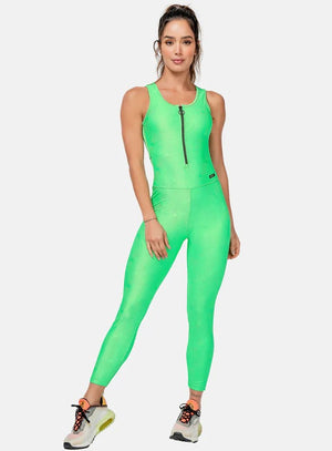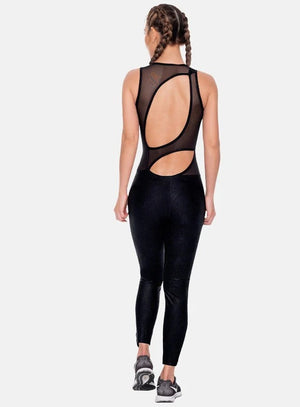 ENTERIZO DEPORTIVO CON CIERRE FRONTAL CON ARGOLLA, MARQUILLA TEJIDA, TELA CON DISEÑO JACQUARD, CORTES EN TELA SEMI TRANSPARENTE.