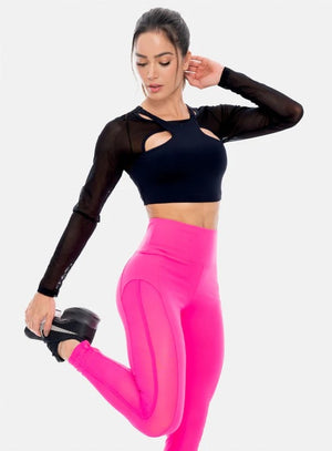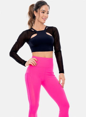 TOP DEPORTIVO CON APLIQUE DECORATIVO REFLECTIVO, CORTES EN TELA SEMI TRANSPARENTE Y ELÁSTICO INTERNO PARA MEJOR AJUSTE.