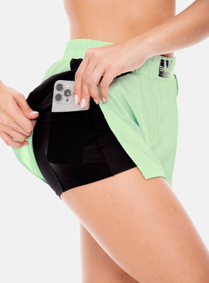 SHORT COMBINADO EN COLORES, DISEÑADO PARA MOVERTE CON TOTAL LIBERTAD, APLIQUE DECORATIVO, Incluye short interno CON BOLSILLO A UN LADO brindando máxima comodidad y evita la fricción ,ELÁSTICO INTERNO PARA MEJOR AJUSTE, TELA SEMI IMPERMEABLE