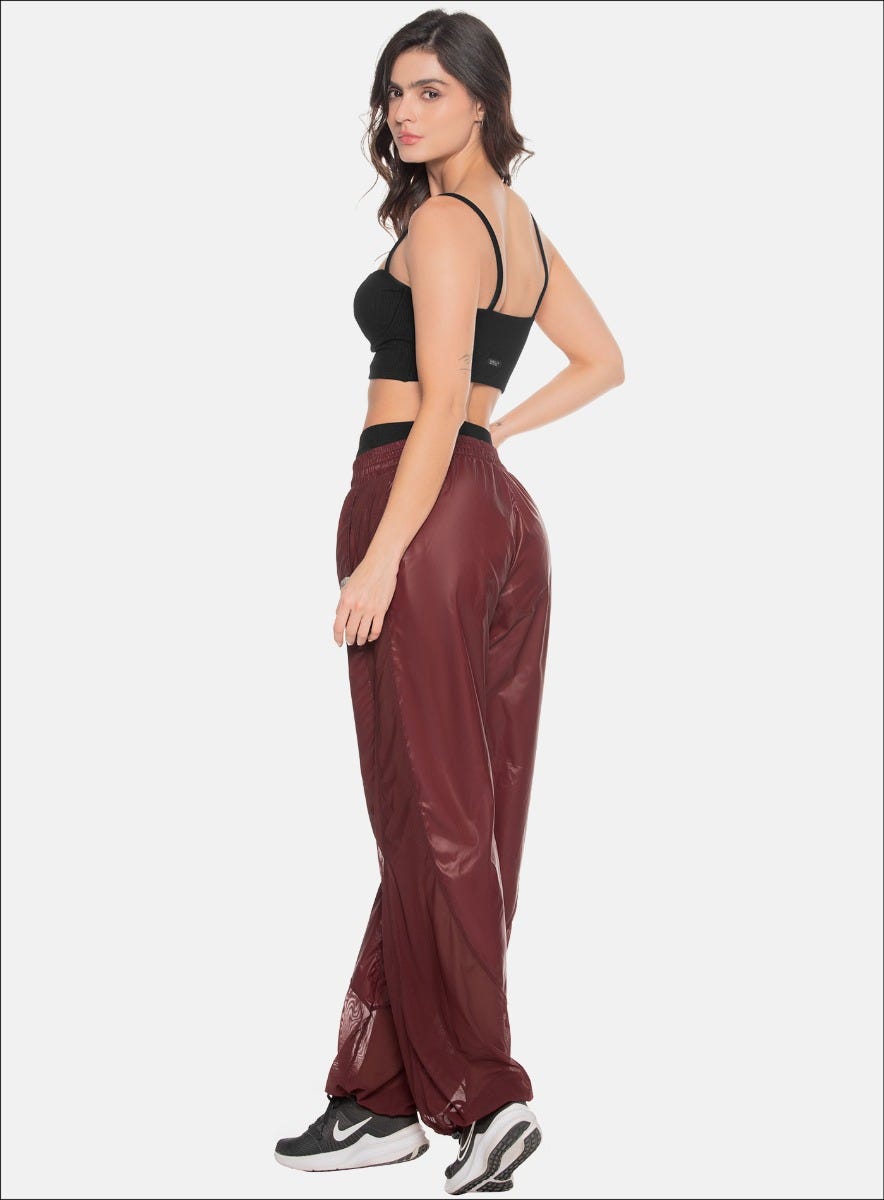 PANTALÓN DEPORTIVO CON CORTES DECORATIVOS EN TELA SEMI TRANSPARENTE, BOLSILLOS FUNCIONALES EN LATERALES Y TELA CON DISEÑO EFECTO BRILLANTE.