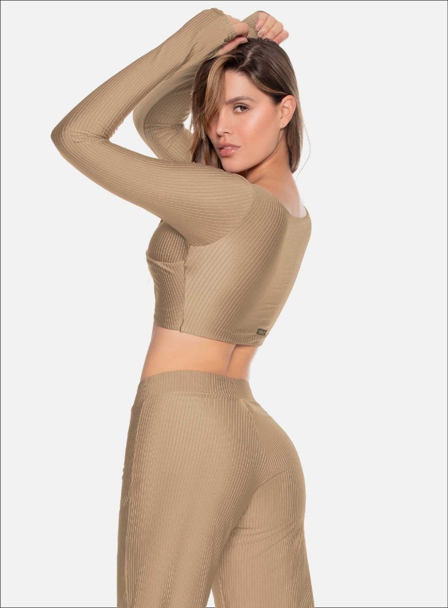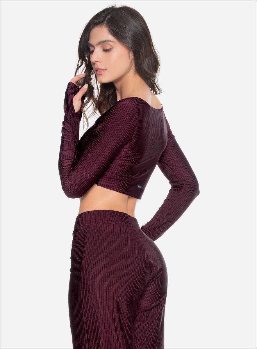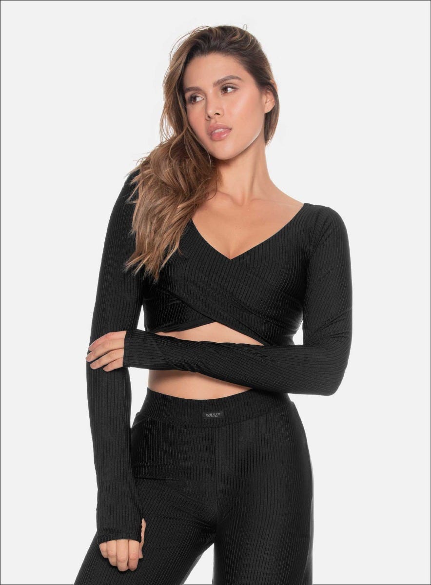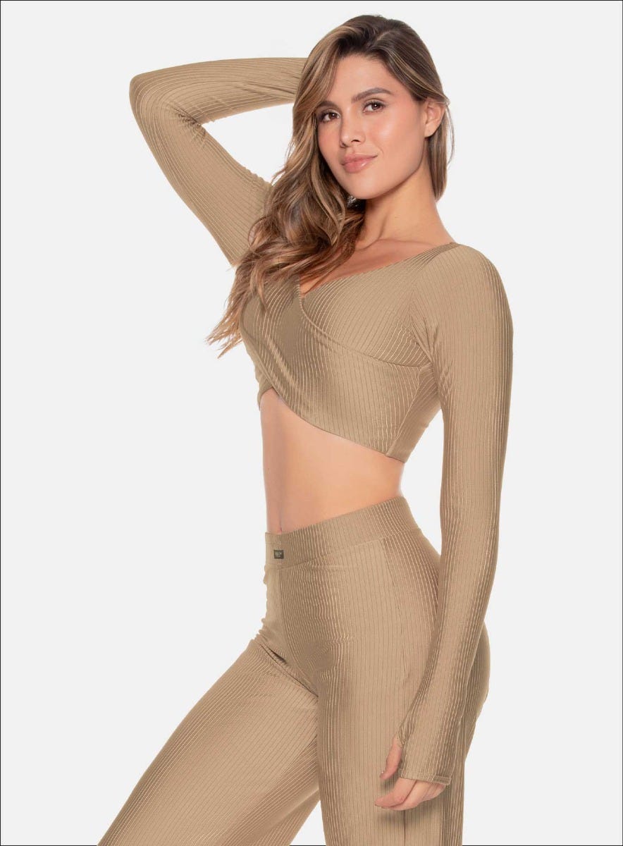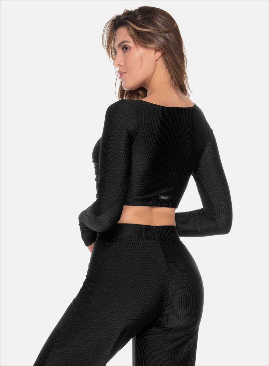 TOP MANGA LARGA CON FRENTE CRUZADO TELA ACANALADA CON EFECTO BRILLANTE