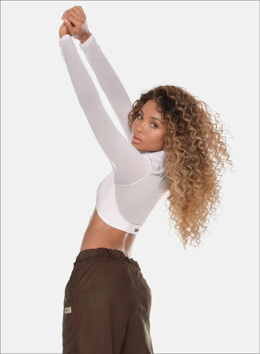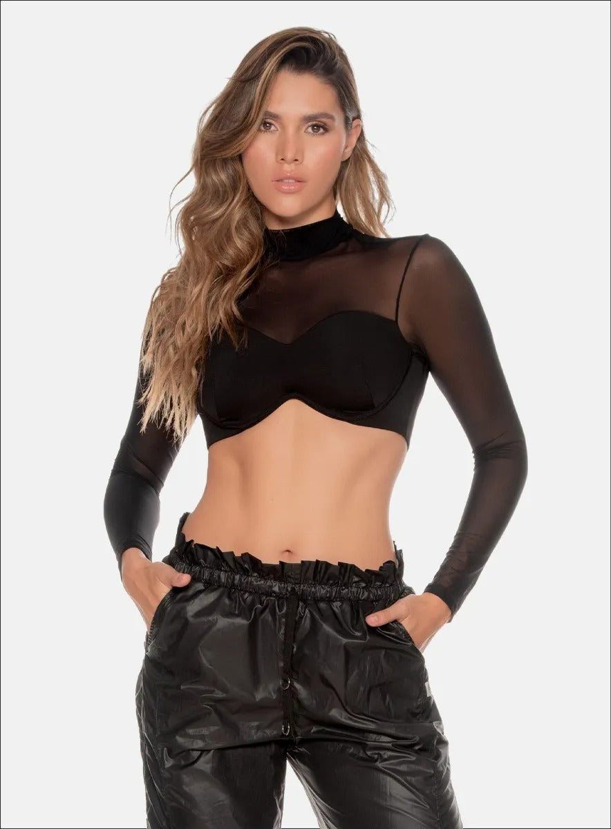 TOP DEPORTIVO CON MANGAS Y TALLE EN MALLA SEMITRANSPARENTE. INCLUYE VARILLA CONTINUA EN LA BASE DEL BUSTO QUE APORTA ESTRUCTURA A LA SILUETA.