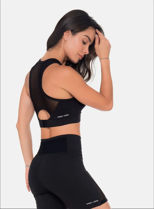 TOP CON FAJÓN Y ELÁSTICO INTERNO, POSTERIOR EN TELA SEMI TRANSPARENTE CON CORTE Y ABROCHADURA GRADUABLE EN LA ESPALDA