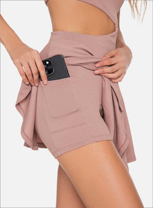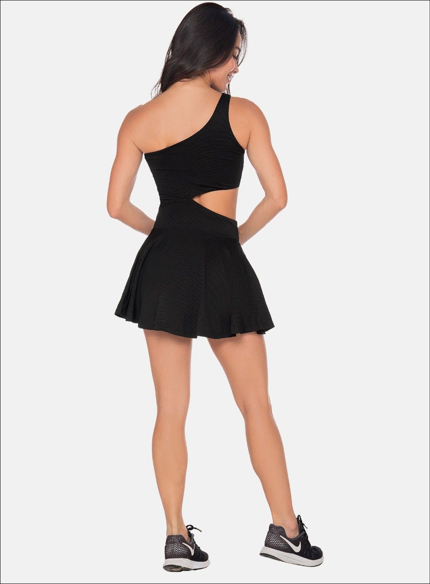 VESTIDO CORTO CON ESCOTE ASIMÉTRICO, CORTE CUT OUT EN COSTADO Y BOLSILLO LATERAL EN SHORT INTERNO