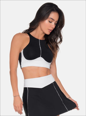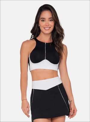 TOP DEPORTIVO CON CORTE CURVO EN PECHO, VARIACIÓN DE COLOR Y SESGO VIVO EN EL CENTRO EN SENTIDO VERTICAL Y CONTRASTE.
