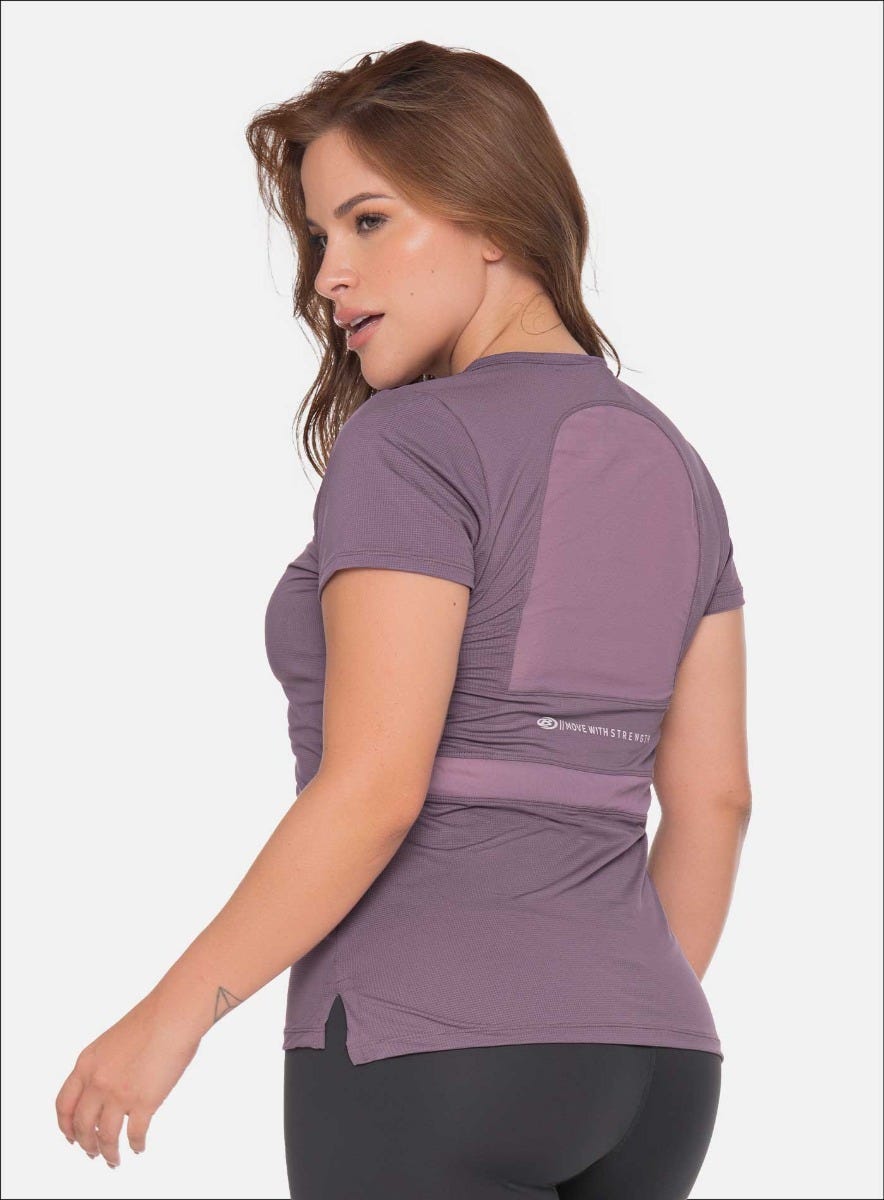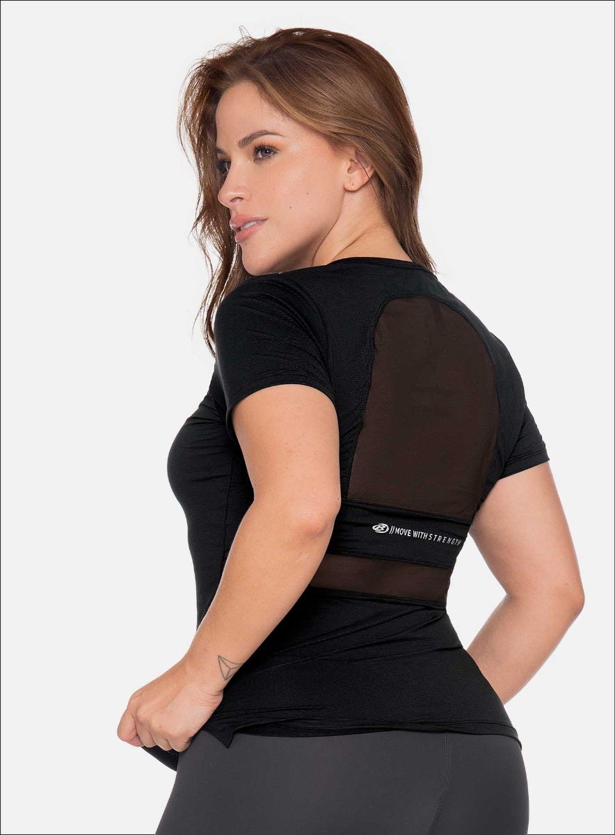 CAMISETA DEPORTIVA MANGA CORTA CON CORTES EN TELA SEMI TRANSPARENTE EN LA ESPALDA Y LEVES ABERTURAS EN LOS COSTADOS