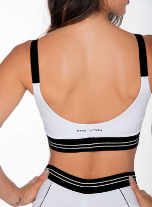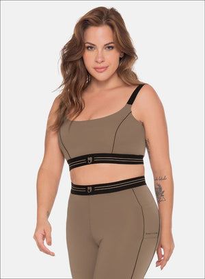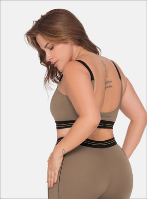 TOP DEPORTIVO CON CARGADERAS EN ELÁSTICO EXPUESTO CON ESPALDA LEVEMENTE PRONUNCIADA Y CORTES EN FRENTE ACOMPAÑADOS CON SESGOS VIVOS.