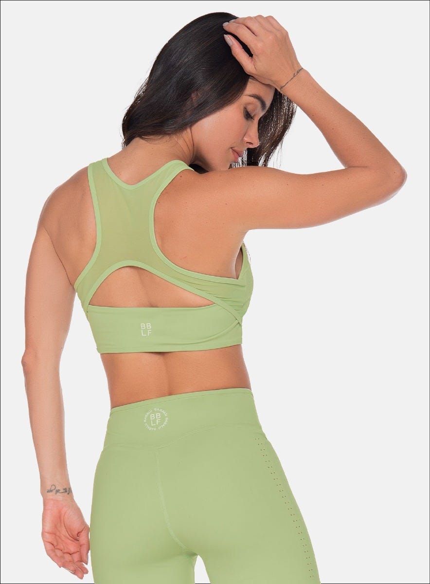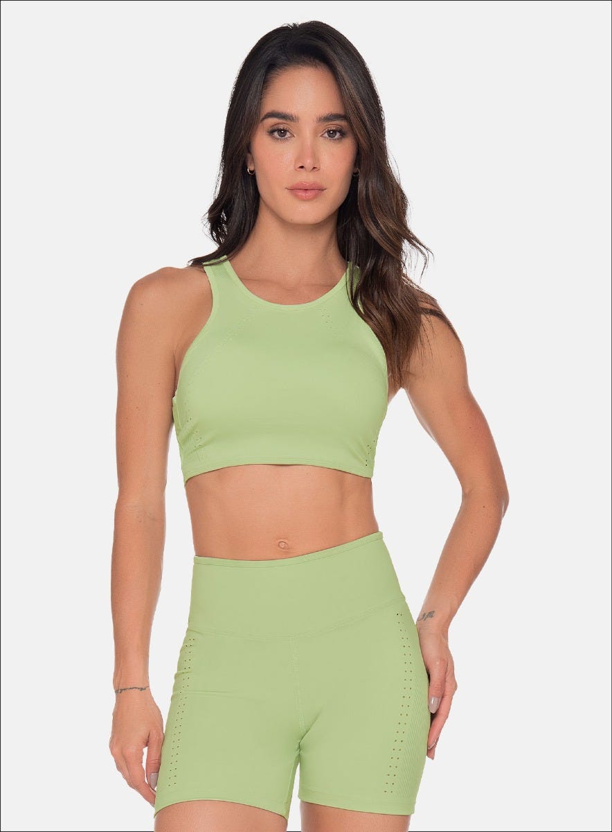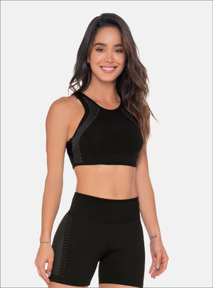 TOP DEPORTIVO CON FORRO INTERNO, ESPALDA EN TELA SEMI TRANSPARENTE, DISEÑO CORTE LÁSER Y ESTAMPADO EN DELANTERO.