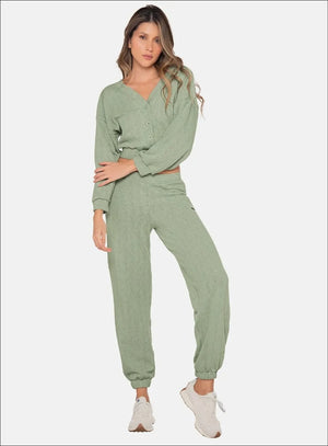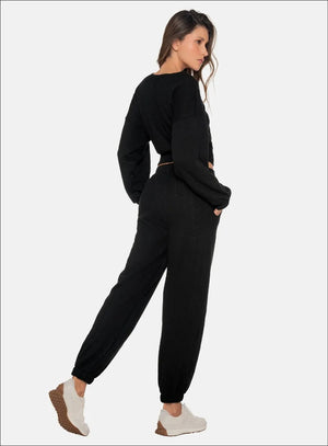 PANTALÓN TEJIDO CON PRETINA Y RUEDO CON ELÁSTICOS INTERNOS, TIENE BOLSILLOS DE CAJA EN LATERALES