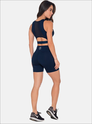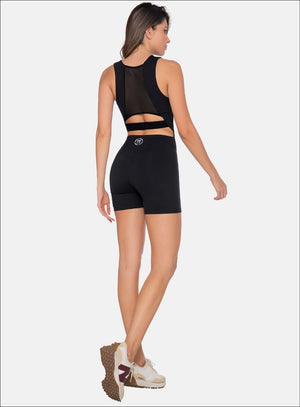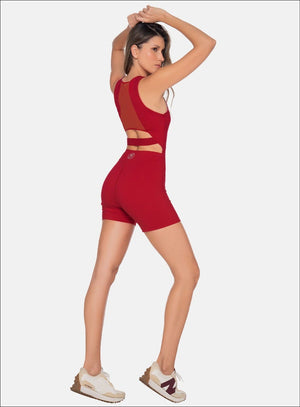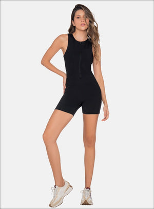 ENTERIZO DEPORTIVO CORTO DE MANGA SISA CON CIERRE FIJO, CORTE EN ESPALDA EN TELA SEMI TRANSPARENTE Y ELÁSTICO EXPUESTO EN ZONA DESCUBIERTA