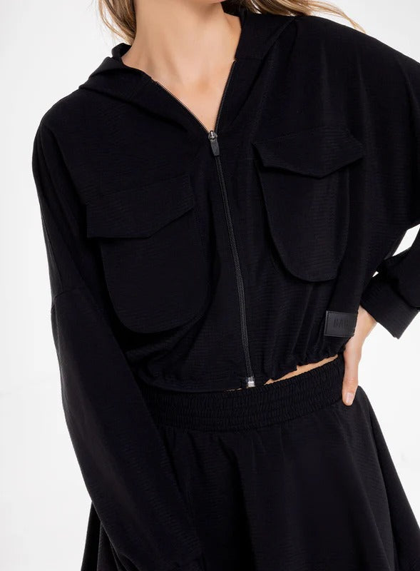 CHAQUETA CON CAPUCHA DE ESTILO MODERNO IDEAL PARA UN LOOK VERSATIL Y CASUAL PARA HACER EJERCICIO O SIMPLEMENTE PARA EL DÍA A DÍA, COMBINA BIEN CON PANTALONES DE TALLE ALTO O LEGGINS