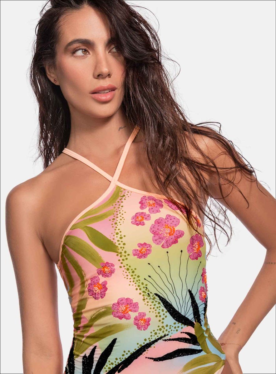 Vestido de baño dos piezas con aplique en pedrería, diseñado para resaltar tu figura con un ajuste cómodo y favorecedor. Su confección en tela de alta calidad con secado rápido te permite moverte con libertad mientras disfrutas del sol.