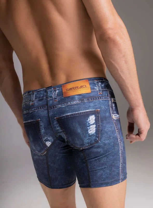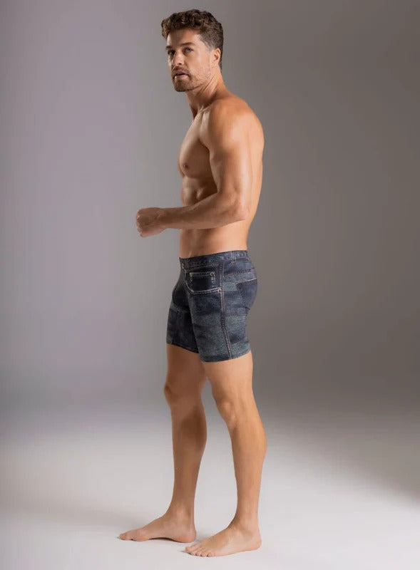 Bóxer sublimado estilo Jean en microfibra con silueta ajustada, talle largo y elástico en cintura.