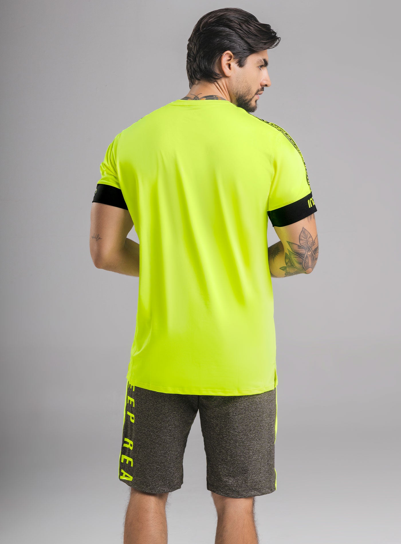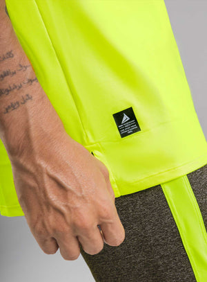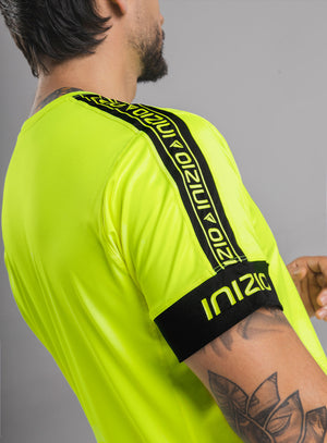 CAMISETA DEPORTIVA HOMBRE CON ESTAMPADO EN HOMBROS Y MANGA, Eleva tu estilo y rendimiento con esta llamativa camiseta deportiva de hombre en color amarillo neón. Diseñada para un entrenamiento dinámico, esta prenda destaca por sus modernos cortes en contraste y detalles gráficos únicos.
