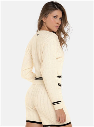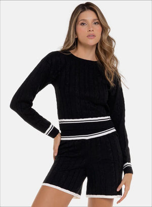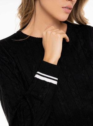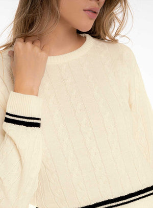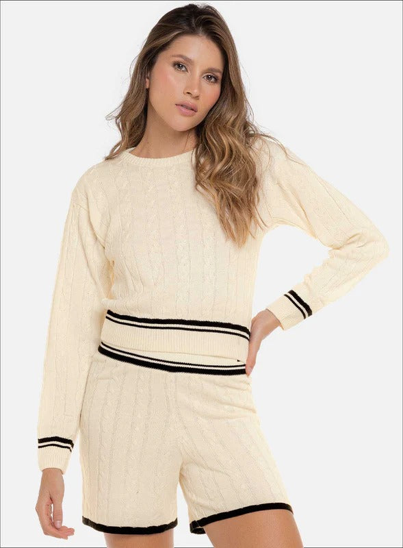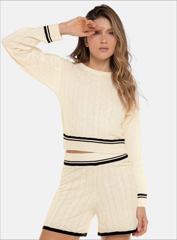 BUZO MANGA LARGA EN TEJIDO ACANALADO CON DELICADAS FRANJAS EN PUÑO Y CINTURA, SU ESTILO CÓMODO Y MODERNO LO HACE IDEAL PARA LOOKS RELAJADOS, PERO CON UN TOQUE CHIC.