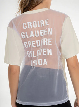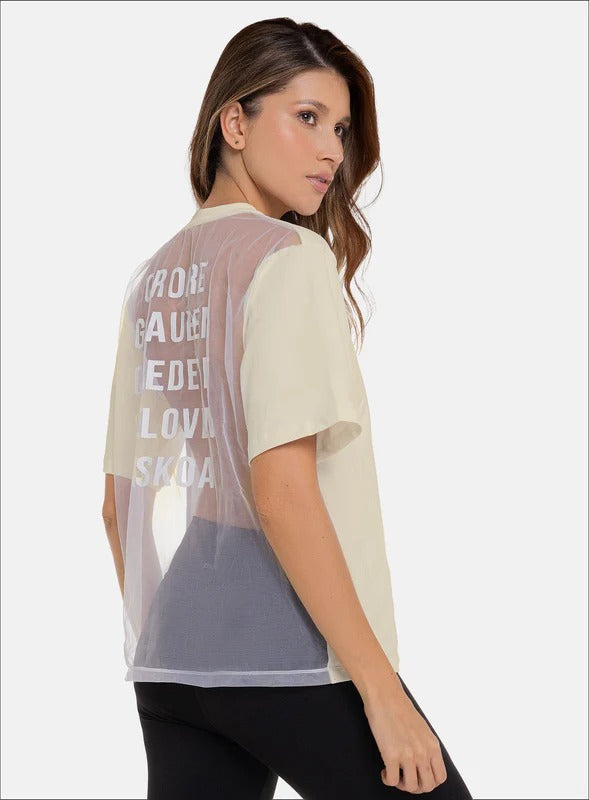 CAMISETA CON TOQUE DISTINTIVO Y POSITIVO CON DISEÑO QUE PERMITE LIBERTAD DE MOVIMIENTO, OPTIMIZANDO RENDIMIENTO SIN RESTRICCIONES, PERFECTA PARA YOGA, PILATES, CORRER O SIMPLEMENTE PARA UN ESTILO DE VIDA ACTIVO Y CONSCIENTE. CONFECCIONADA EN TELA BURDA Y MALLA TRANSPARENTE