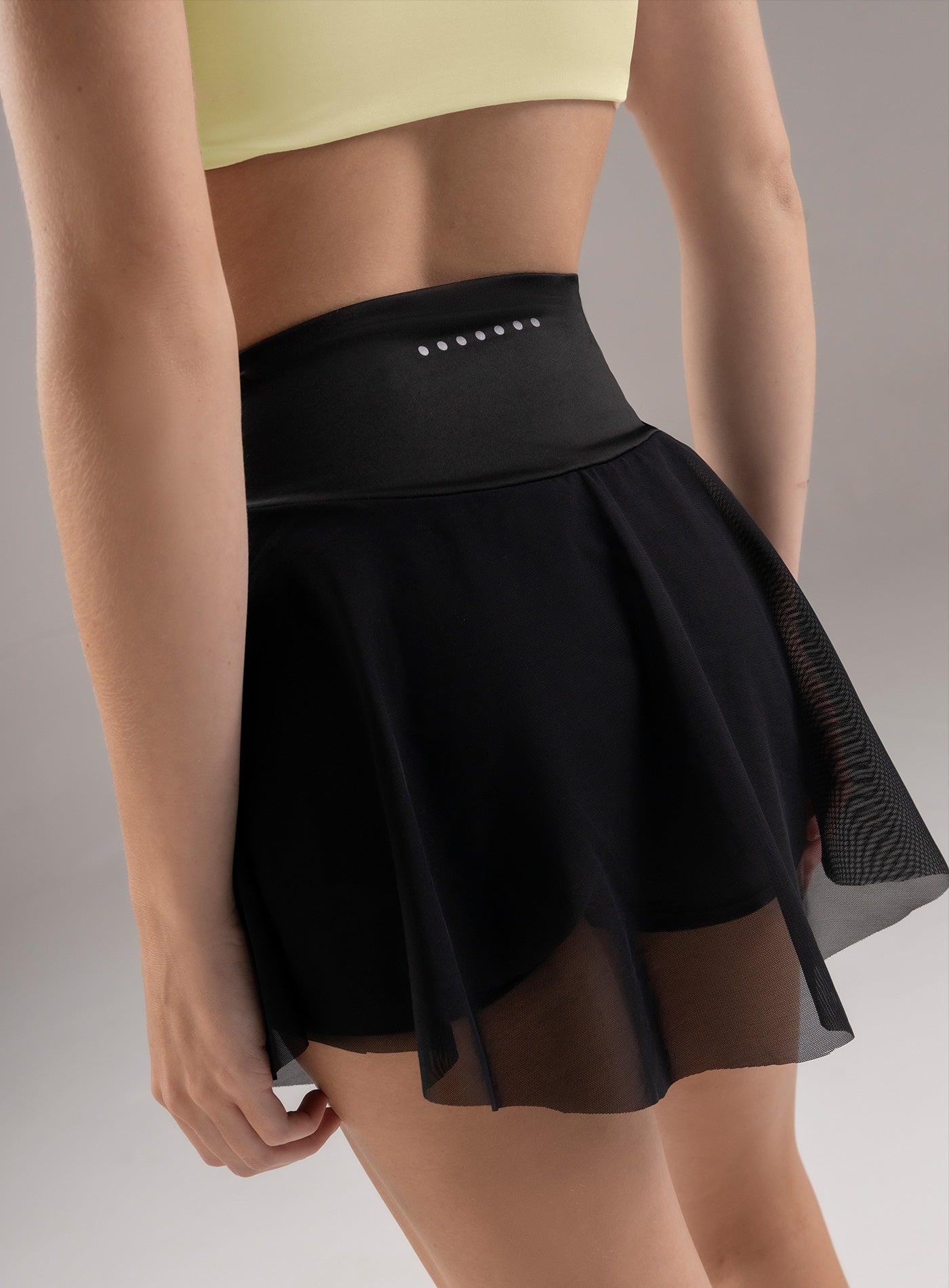 falda deportiva dama en tela semi transparente con elástico interno en pretina para mejor ajuste, incluye short interno brindando máxima comodidad y evita la fricción, esta falda deportiva destaca por su diseño funcional de dos texturas: una pretina ancha y una capa lisa en malla tull que aporta frescura y movimiento. gracias a su estilo versátil y femenino, es ideal para deportes de alta intensidad, pero también funciona perfectamente para correr, ir al gimnasio o incluso para un look con un toque casual.