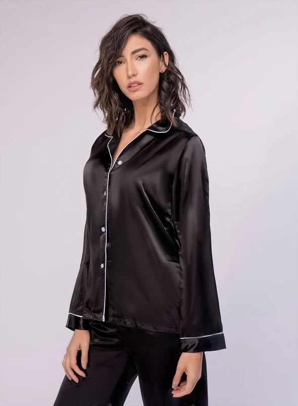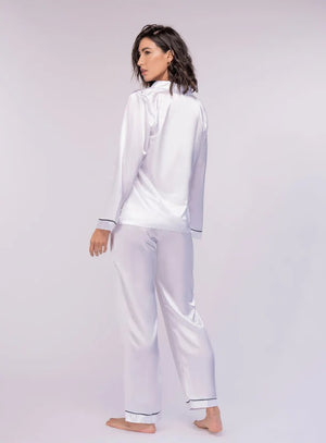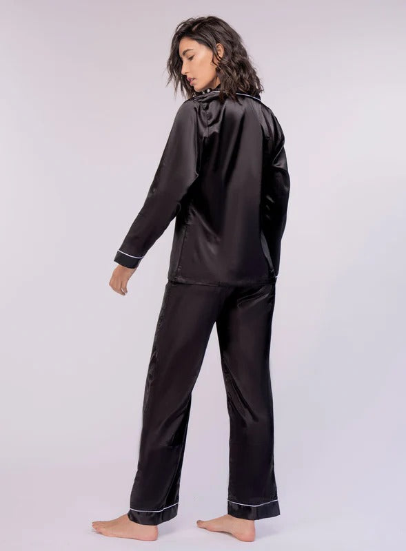 PIJAMA EN SATIN, CON RIBETES EN CONTRASTE Y PRETINA ELASTICA PARA UNA APARIENCIA COMODA, MODERNA Y ELEGANTE.