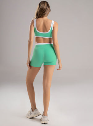 Short deportivo dama con pretina en punta para mejor apariencia y alta para mayor compresión. frente entero con contraste de color en pretina, elástico interno para mejor ajuste y con refuerzo en triangulo para evitar marcaciones y mayor comodidad en los movimientos